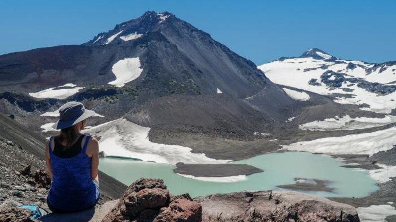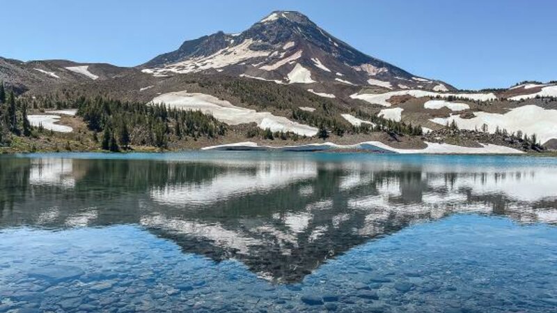We have hiked in the Three Sisters Wilderness many times and have always enjoyed our experience.  However, accessing views of Collier Glacier can be a bit of a challenge. Located in the saddle between North and Middle Sister, Collier Glacier views, on the north edge of Collier Cone, are obtained after a seven and a half mile hike from Lava Camp Lake Trailhead through Matthieu Lakes or the Obsidian Trailhead. While only 1/2 mile off the Pacific Crest Trail, to reach the edge of Collier Cone involves a scramble up a steep pumice hill, but once you arrive, the setting is spectacular with the glacial lake and towering vistas of North and Middle Sister and Little Brother.  We hiked this trail 7-15-23 during one of the hottest days of the year. Although we started the hike early, it took almost 8 hours to complete it and much of the trail was exposed to the sun in lava fields or burned forest. However, there were beautiful shaded areas near Matthieu Lakes and our experience was wonderful. We brought a lot of water and enjoyed refilling a water container at Minnie Scott Spring where water can be seen percolating through the small stones. The total hike was over 15 miles and over 2500 feet of elevation gain.