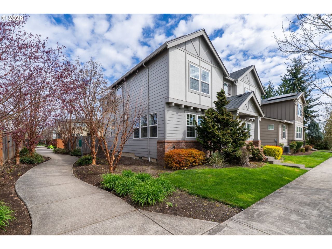 This thoughtfully designed home offers a highly desirable floor plan, a bright, open feel & laminate wood floors throughout. ---The main level features an open-concept layout, centered around a light-filled kitchen w/ stainless appliances, granite, white cabinetry, a large island, & an oversized walk-in pantry. The space flows seamlessly into the dining room & living room w/ a gas fireplace. A main-level bedroom w/ direct patio access & full bathroom provide excellent flexibility for guests, multigenerational living, or a private home office.---Upstairs, the generously sized primary suite offers a comfortable retreat w/ sitting area & an impressive walk-in shower. This level also includes two additional bedrooms & a well-designed laundry room featuring a rare, walk-in linen closet.---Positioned across from open farmland, the home enjoys a peaceful view. A long, deep driveway provides ample parking. For easy living, enjoy the low maintenance backyard w/ concrete patio, a tankless water heater, leased solar panels & 220V in garage for car charger. ---Conveniently located just minutes to Intel, shopping, restaurants, coffee, The Reserve Vineyards & Golf Club, movies & entertainment. [Home Energy Score = 8. HES Report at https://rpt.greenbuildingregistry.com/hes/OR10181865]